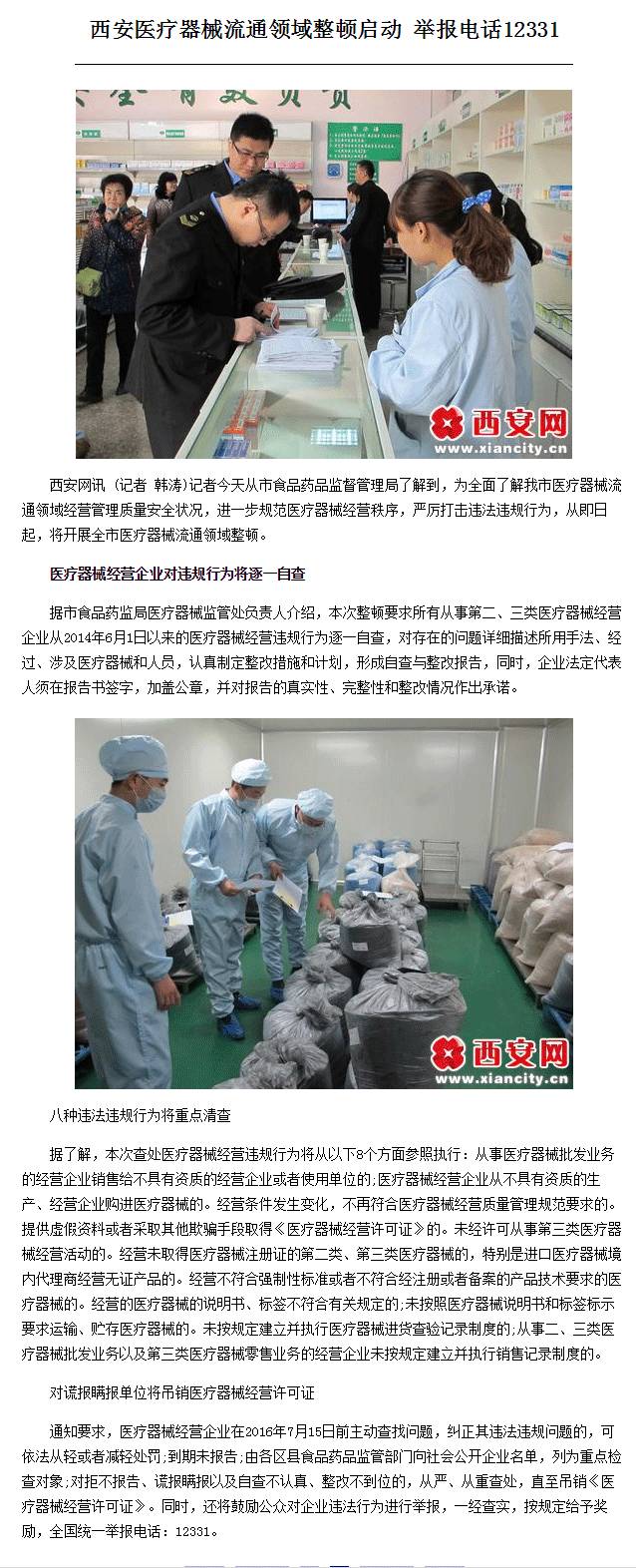 在经过一周时间的酝酿与布局,西安市******打破了各地方药监局的“集体沉默”。6月15日,西安市药监局宣布即日起全面开展全市医疗器械流通领域整顿。从报道中看出,西安市药监局此次整治的内容完全延续6月7日CFDA发布的《公告》中的整治内容。预计,西安市药监局只是打响地方器械流通领域整治,其他地方的药监局也将会紧随其后,一场声势浩大的医疗器械经营大整治即将来临。